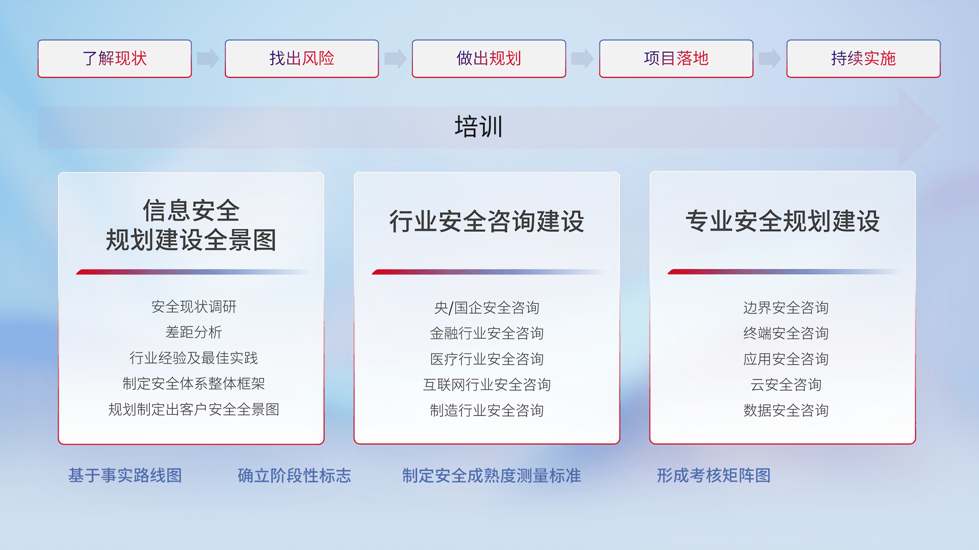 梳理客户信息安全现状调研、、、、差距分析结果,,,,结合行业先进经验及最佳实践,,,,制订客户的信息安全管控体系总结架构,,,,最终形成一个完整的客户信息安全规划与建设的全景图。。。